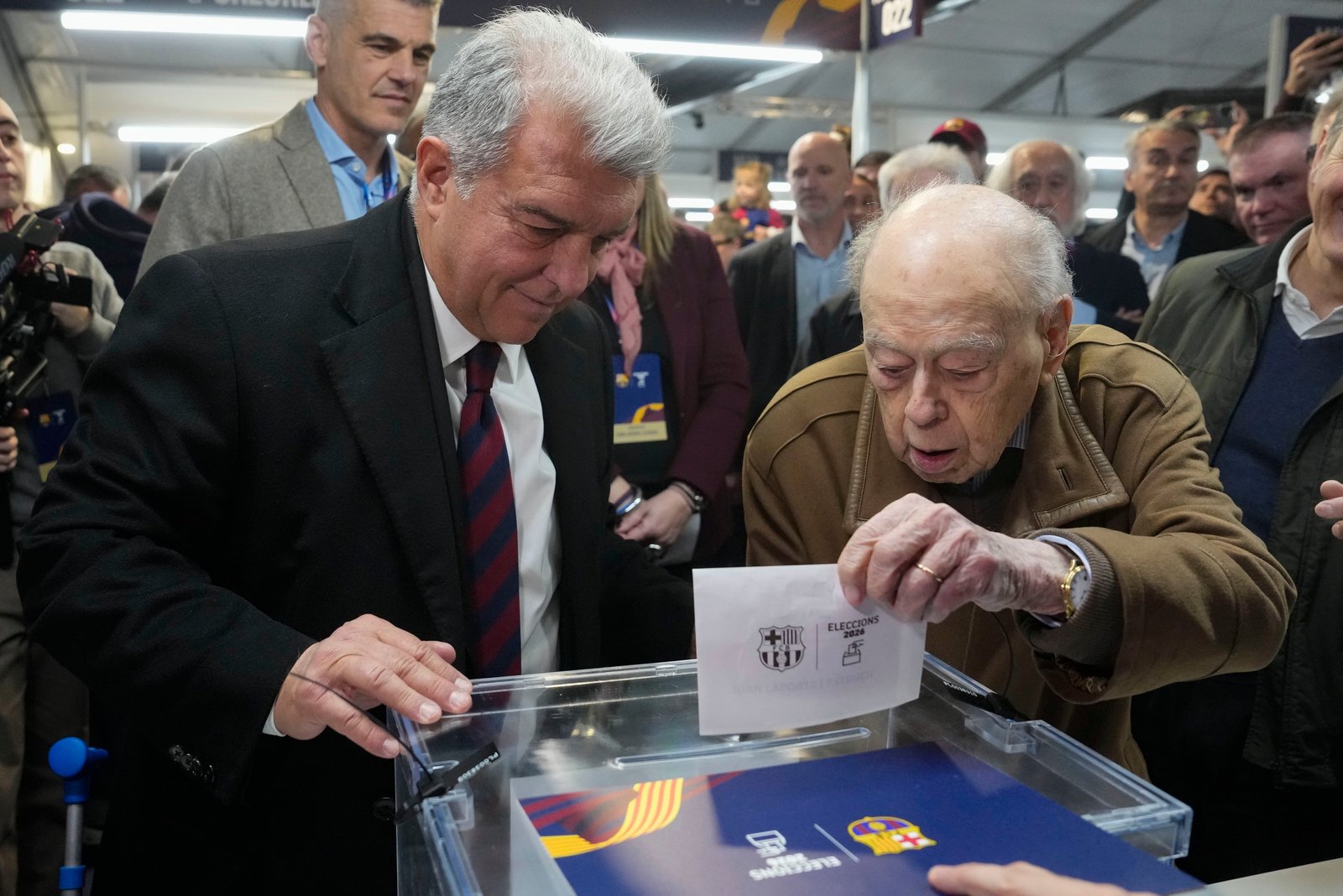 Joan Laporta, entre Aitana Bonmatí y Jordi Pujol en las elecciones del Barcelona