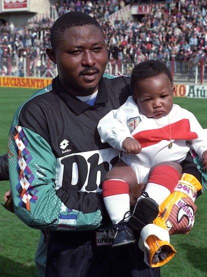 Wilfred Agbonavbare quiso quedarse cerca de esa gente los seis años que jugó en Vallecas. En el barrio, el portero nigeriano se sentía protegido de aquellas hordas de energúmenos que, rabiosos porque parecía que no había forma de meterle un gol, ni siquiera el Madrid y ni siquiera de penalti, le gritaban: “¡Ku, Klux, Klan! [sangriento grupo supremacista nacido en EEUU]» o “¡Negro, cabrón, recoge el algodón!“ sin consecuencia alguna. El documental Eterno Wilfred (Movistar Plus +) muestra una colección de sus mejores intervenciones, colgando balones al área contraria en un saque de puerta; multiplicándose como un pulpo entre los tres palos para parar tres envestidas seguidas a esa distancia en la que portero y delantero se miran a los ojos; volando con su 1,90 de estatura dentro de la portería en una palomita imposible para despejar el zambombazo de una estrella del Madrid… Las imágenes sirven de homenaje, pero también para subrayar lo dramático de lo que vino después.